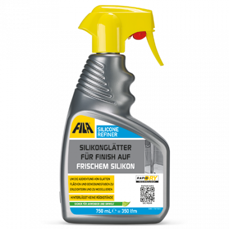 Mit dem für den Fugenwinkel am besten geeigneten FILA-Spachtel endbearbeiten.Bei radialen Formen empfiehlt es sich, nach erneutem Aufsprühen von SILICONE REFINER den Dichtstoff noch einmal zu bearbeiten, um eventuelle Unregelmäßigkeiten auszugleichen.