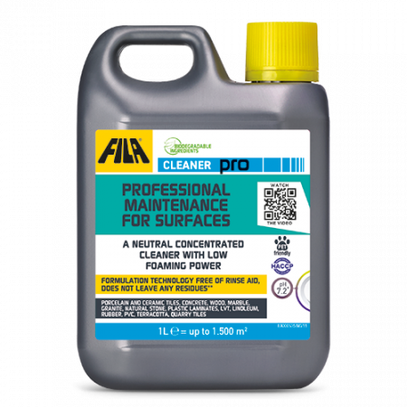 For regular cleaning and maintenance of all surfaces:Dilute CLEANER PRO at 1:200 (25 ml in 5 litres of water). No need to rinse. For more stubborn dirt, wash using more concentrated solutions.For washing after laying of delicate surfaces (marble, travertine, granite, polished agglomerates etc.):Dilute CLEANER PRO at 1:30 and wipe over the floor with a soft single-disc machine or scrubbing brush. Remove any residues using a liquid vacuum cleaner or cloth. Rinse after cleaning.For scrubber-dryer machines:Dilute CLEANER PRO at 1:200. Pour the solution into the tank.For heavy-duty cleaning and maintenance of heavily soiled surfaces:dilute CLEANER PRO from 1:30 to 1:50 depending on dirt intensity. Wash using a cloth or large brush. Remove the dirt and rinse.