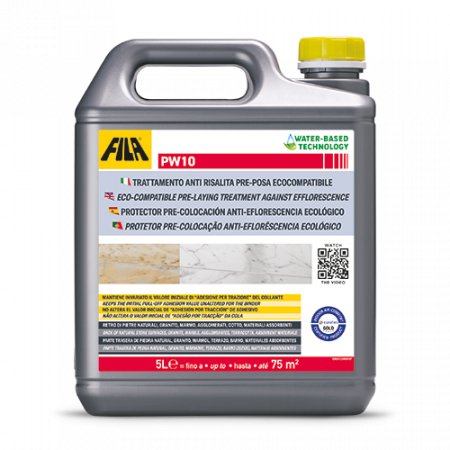 TRATAMIENTO PRE COLOCACIÓN: PROTECIÓN 5 LADOS para bloquear los agentes contaminantes (manchas, manchas amarillas, errores en colocación de la cola) de la parte trasera y de lso 4 lados del material.Limpiar bien la parte posterior de la baldosa o de la placa eliminando el polvo y todo tipo de residuos. Con superficie seca, aplicar el producto con brocha, pulverizado o con sistema airless de modo uniforme evitando charcos de producto.Dejar actuar entre las 12 (con temperaturas entre 20°C y 40°C) y las 24 horas (con temperaturas entre 10 y 20 °C) antes de colocar el material. Elegir el adhesivo apto al tipo de colocación según la normativa técnica de referencia o averiguando con el fabricante del adhesivo.Estocar el material de modo que pueda secar completamente. Despúes del lavado inicial es posible completar el tratamiento de la superficie con el protector en base acuosa o en base disolvente más idóneo al uso del material.PROTECCIÓN 6 LADOS: con situación de fuerte humedad, para bloquear los agentes contaminantes de la parte trasera y de los 4 lados del material (óxido, manchas amarillas, errores de colocación) y para crear un efecto hidrorepelente en la parte superior.Limpiar bien todas las caras de de la baldosa eliminando el polvo y los residuos. Aplicar una mano de PW10 con brocha, pulverizado o con sistema airless de modo uniforme por todos los lados sin dejar charcos.Es posible sumergir el material en el producto durante unso 30 segundos. Los residuos de producto deben ser eliminados con un paño, evitando charcos de producto en la superficie.Dejar actuar entre las 12 (con temperaturas entre 20°C y 40°C) y las 24 horas (con temperaturas entre 10 y 20 °C) antes de colocar el material. Elegir el adhesivo apto al tipo de colocación según la normativa técnica de referencia o averiguando con el fabricante del adhesivo.Despúes del lavado inicial es posible completar el tratamiento de la superficie con el protector en base acuosa o en base disolvente más idóneo al uso del material.APLICACIÓN POST-COLOCACIÓN, PROTECCIÓN SUPERFICIAL: para crear un efecto hidrorepelente en la parte anterior de la baldosa. Con superficie limpia y seca aplicar el producto impregnando el material con brocha, pulverizado o con sistema airless.Antes de que el producto esté seco, eliminar los eventuales residuos pasando un paño limpio. La superficie está seca en 6 horas. El sistema airless se consiente solo a utilizadores profesionales utilizando los oportunos DPI, como indicado en ficha de seguridad.LIMPIEZA DE LAS HERRAMIENTAS: limpiar con agua enseguida despúes del uso.